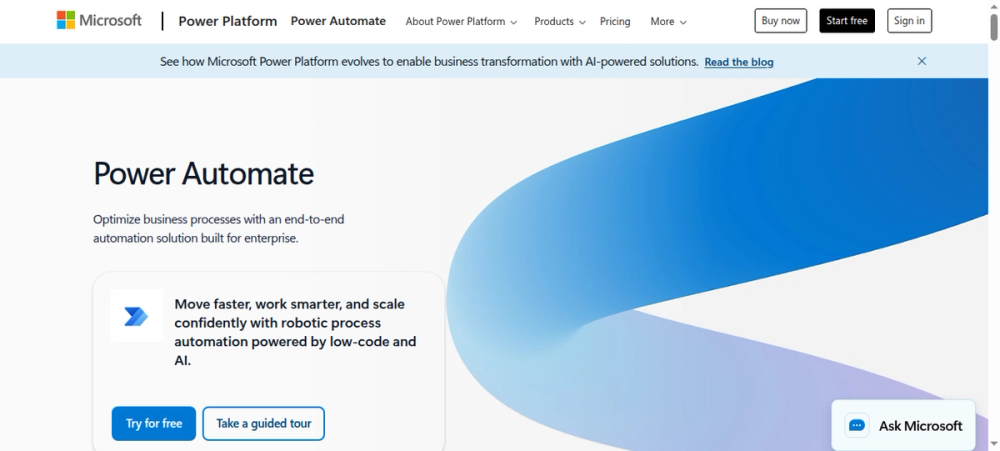 Microsoft Power Automate is the enterprise automation layer for the Microsoft ecosystem. AI Builder adds drag-and-drop AI models for document processing and prediction. Desktop RPA is included for automating legacy desktop applications.