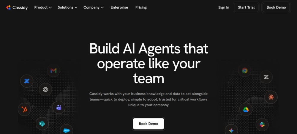 Cassidy AI ingests company knowledge, SOPs, and documents, then uses that context to power automations. Agents produce company-specific responses grounded in your policies. Serves 20,000+ teams and is SOC 2, HIPAA, GDPR compliant.
