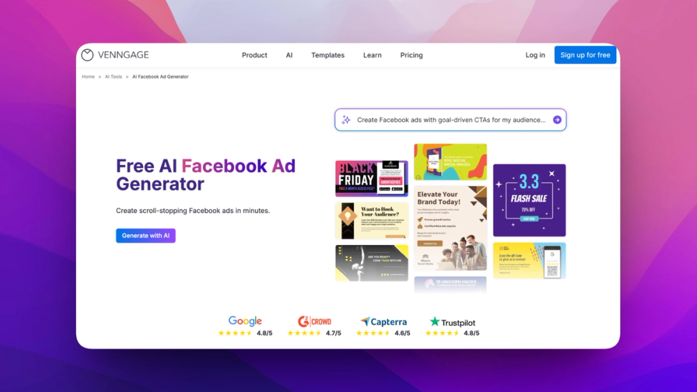 Platform-Aligned Layouts: Generates ad formats structured for Facebook feeds, stories, and other placements.