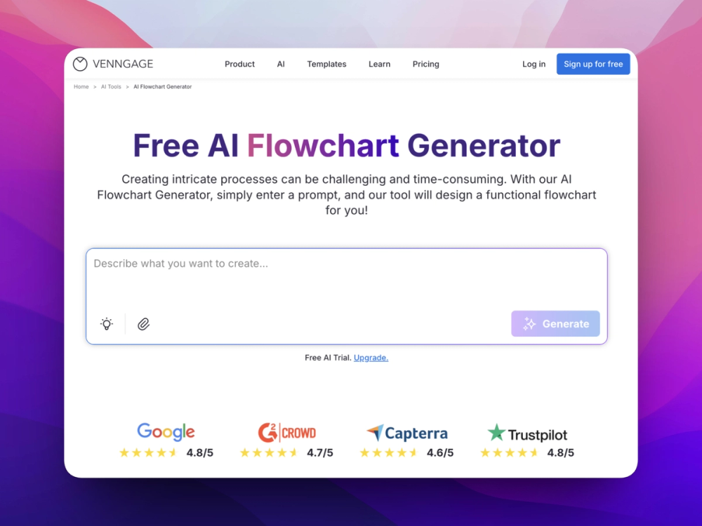 The AI Flowchart Generator helps teams turn written processes andideas into clear, easy-to-follow flowcharts using Venngage’s trusted design system and standard flowchart conventions. By simply describing a workflow or decision path in plain language, users can generate structured flowcharts automatically and refine them with a drag-and-drop editor, making process visualization simple, fast, and accessible for documentation, planning, and communication.