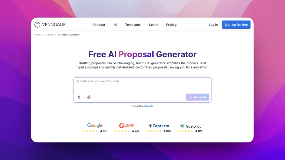 The AI Proposal Generator helps teams create clear, professional proposals without starting from scratch. Built for sales, marketing, consulting, and internal teams, it transforms simple project details into structured, editable proposal drafts that follow common business formats and expectations.