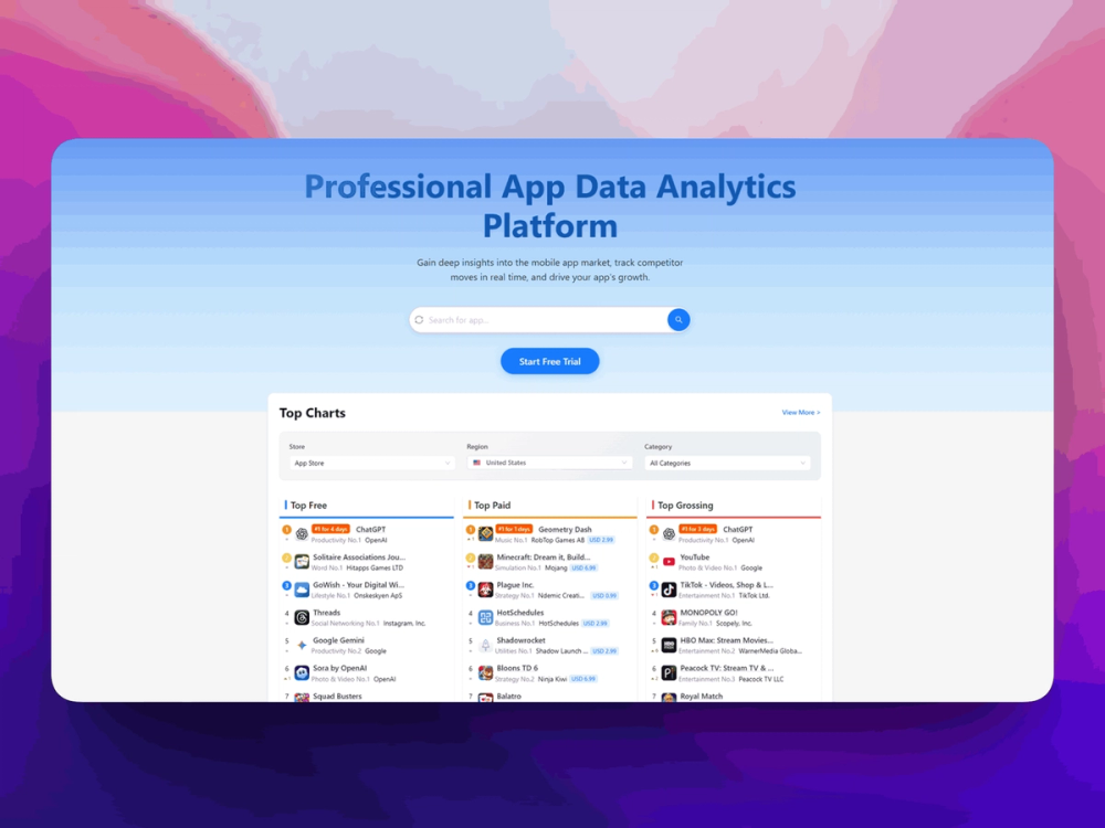 - Market Research Insights: Identify trending apps, fast-growing categories, and promising niches before launch.