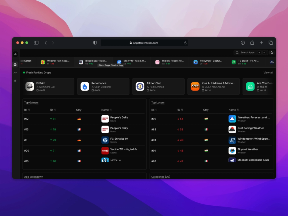 App Store Tracker is a real-time monitoring platform that tracks iOS app ranking movements across the App Store. It highlights major ranking gains, drops, and new chart entries across countries and categories, helping developers and marketers stay aware of market changes as they happen.