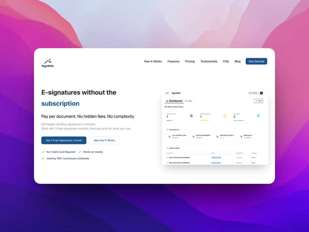 SignWith is a simple e-signature tool designed for individuals and small teams who want a flexible, low-cost way to sign documents. Instead of subscriptions, it offers a pay-per-document model with a few free signatures each month, making it ideal for users who don’t need frequent signing but still want a fast, reliable workflow.